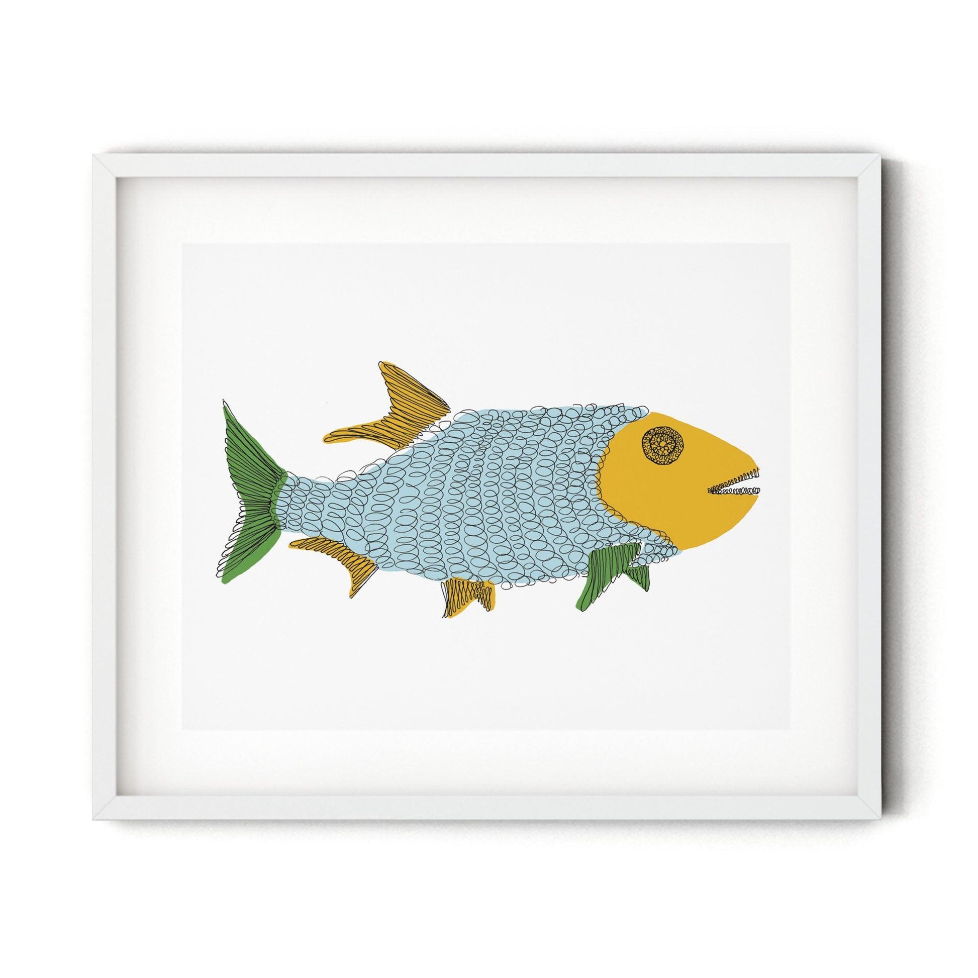A playful illustrated design featuring a blue fish drawn with curls and coils. High quality print based on an original ink drawing (digitally colored). Colors may vary due to monitor settings.