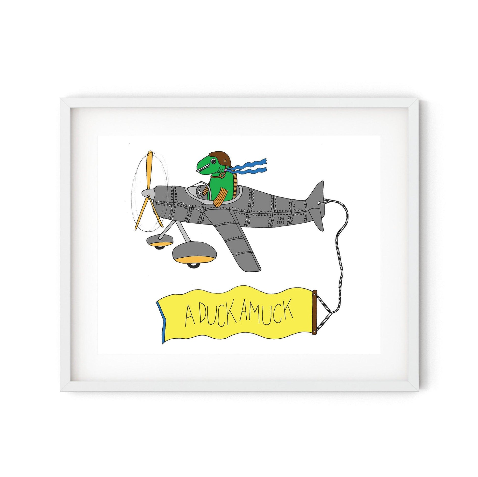 A playful illustrated design featuring a fish flying a prop plane. High quality print based on an original ink drawing (digitally colored). Colors may vary due to monitor settings.