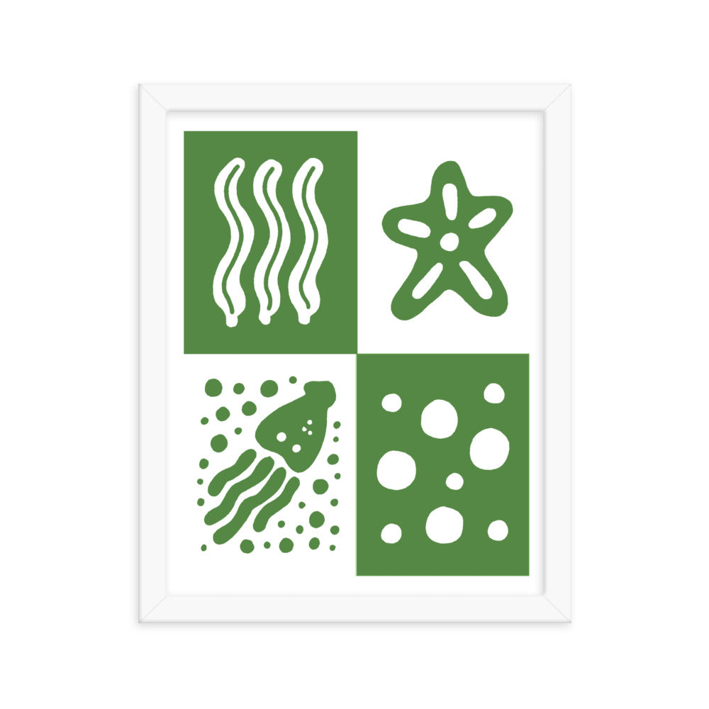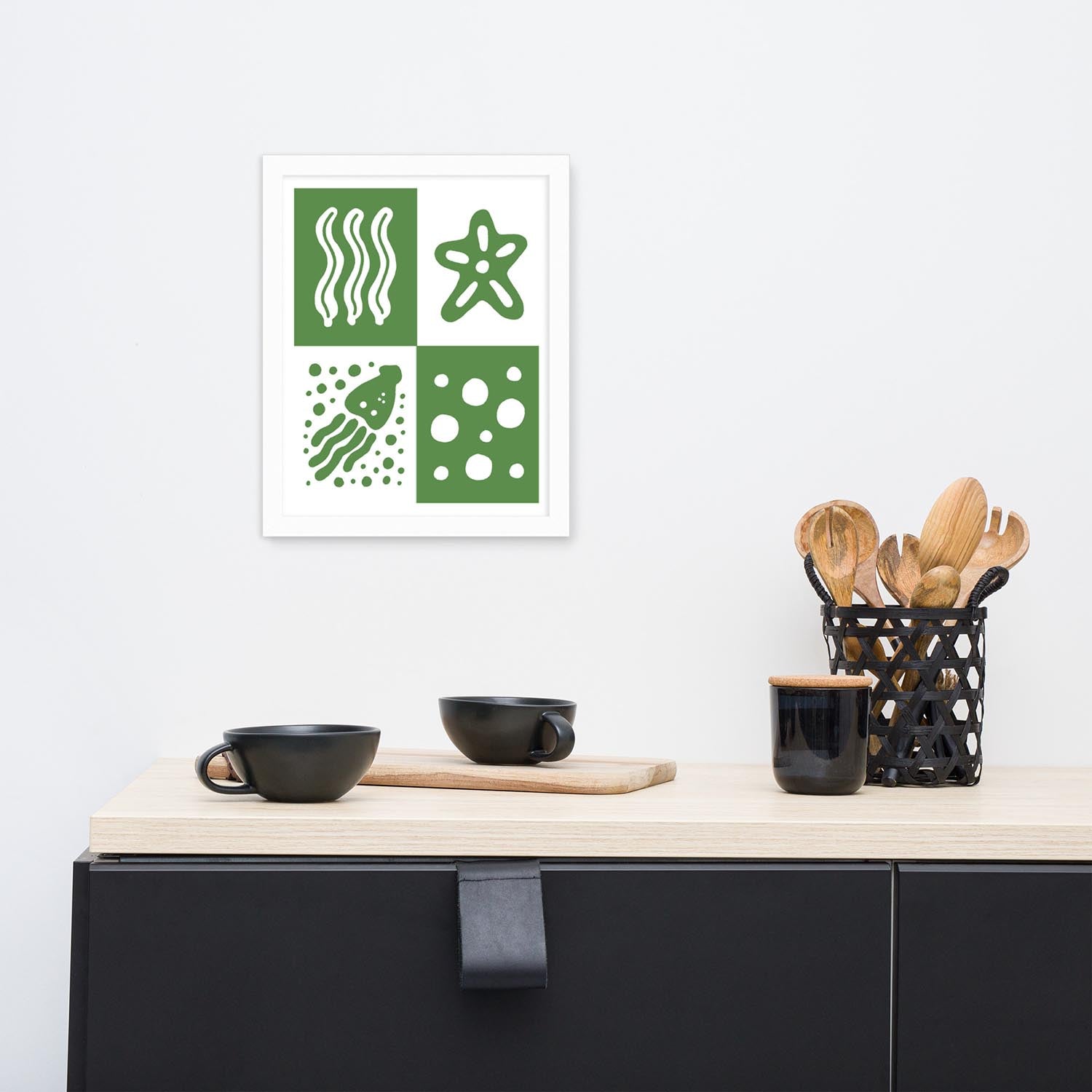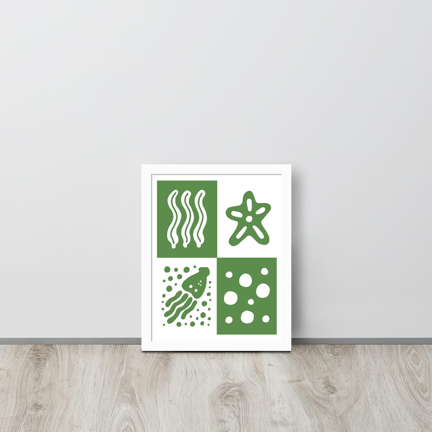 - Framed under clear styrene plastic with a white wood frame .71 inches deep and wall mounts