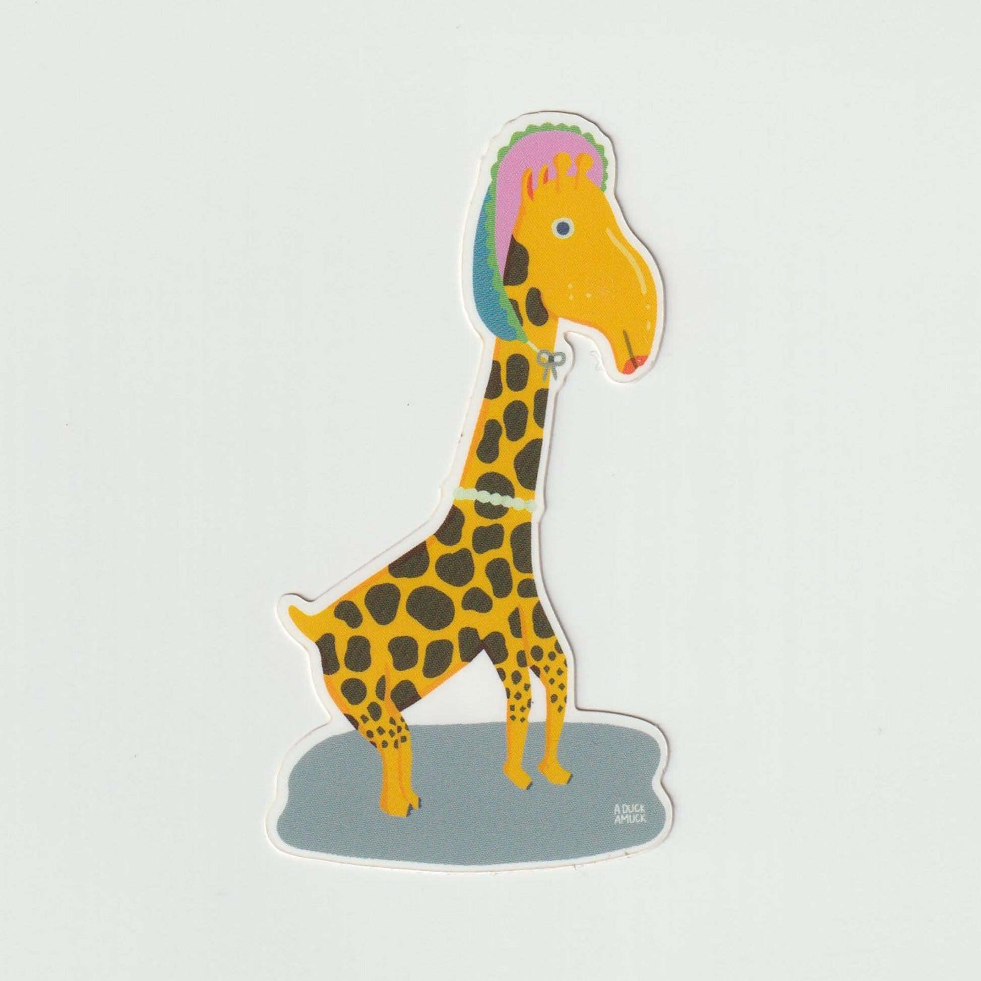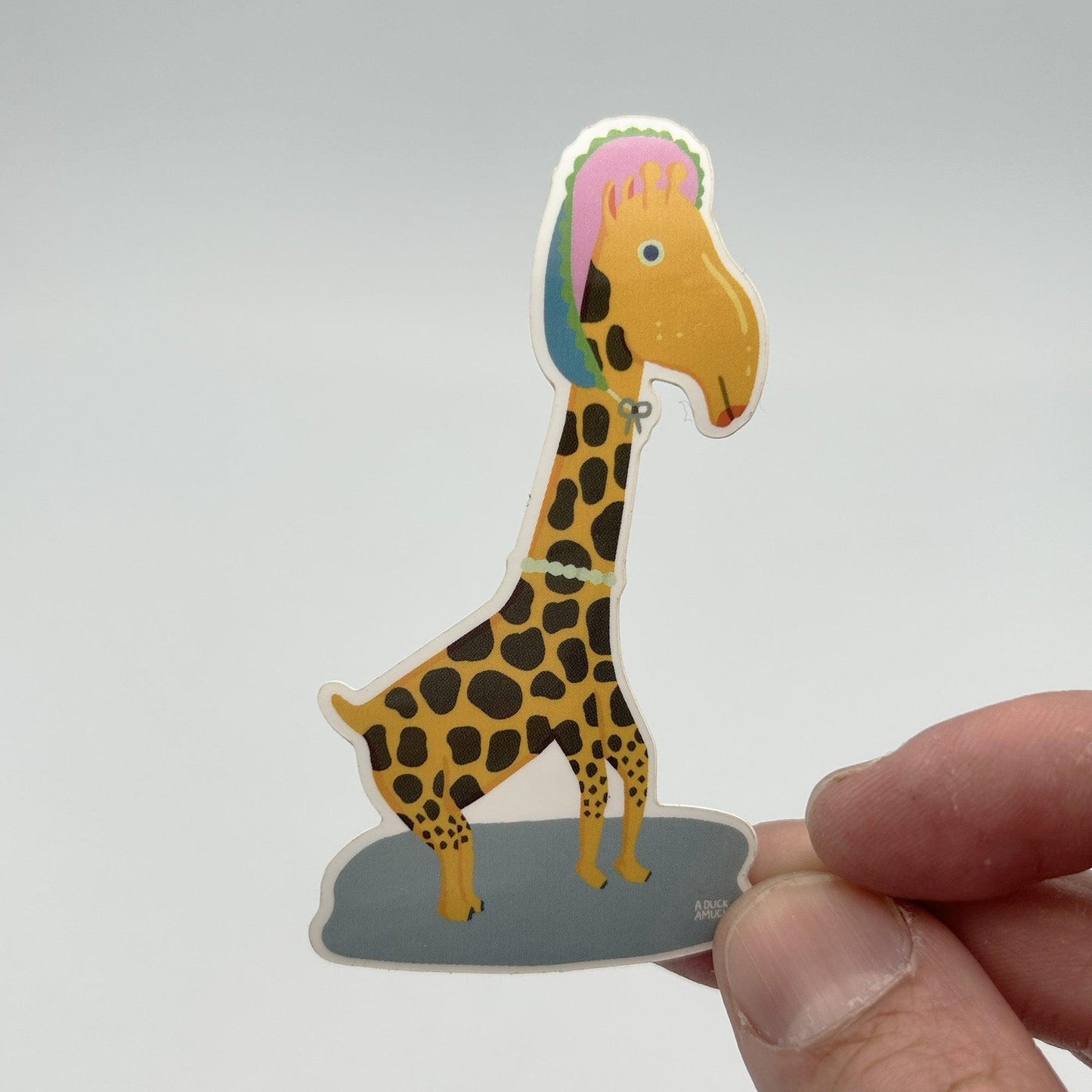 This vinyl sticker features an image of giraffe wearing a bonnet and a pearl necklace. The sticker measures approximately 2"x3" and has a glossy laminate finish.