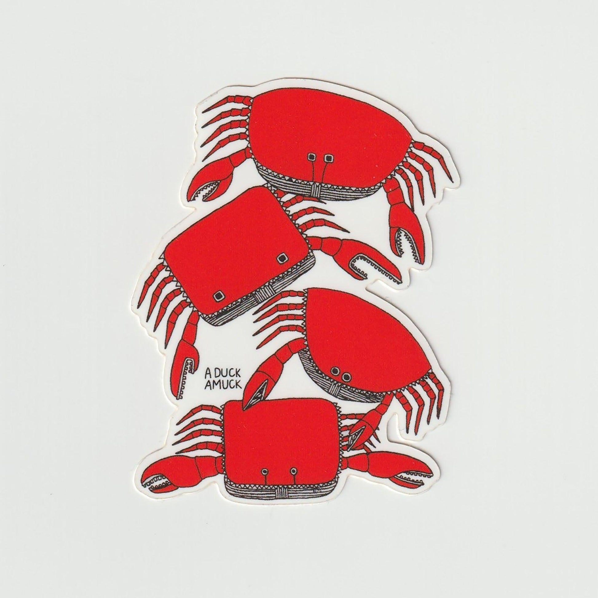 This vinyl sticker features an image of a pile of crab. The sticker measures approximately 2"x3" and has a glossy laminate finish.