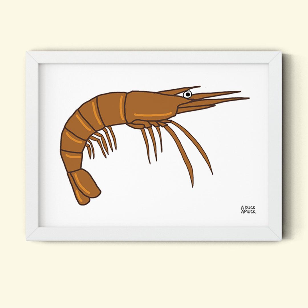 A playful drawing of an orange shrimp against a white background. Each illustration is created by artist Erwin Ong.