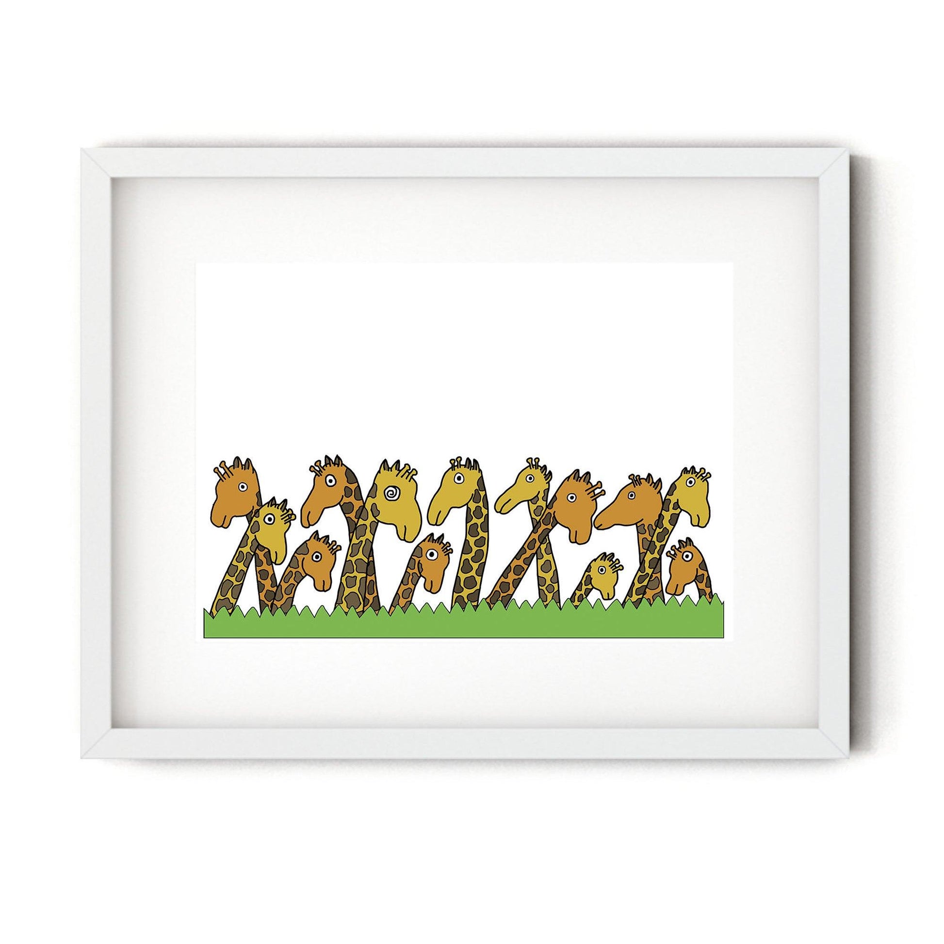 A playful illustrated design featuring a group of giraffes (including one that looks like they forgot to have their morning coffee -- can you tell which one?). The print is based on an original ink drawing and digitally. Colors may vary due to monitor settings.