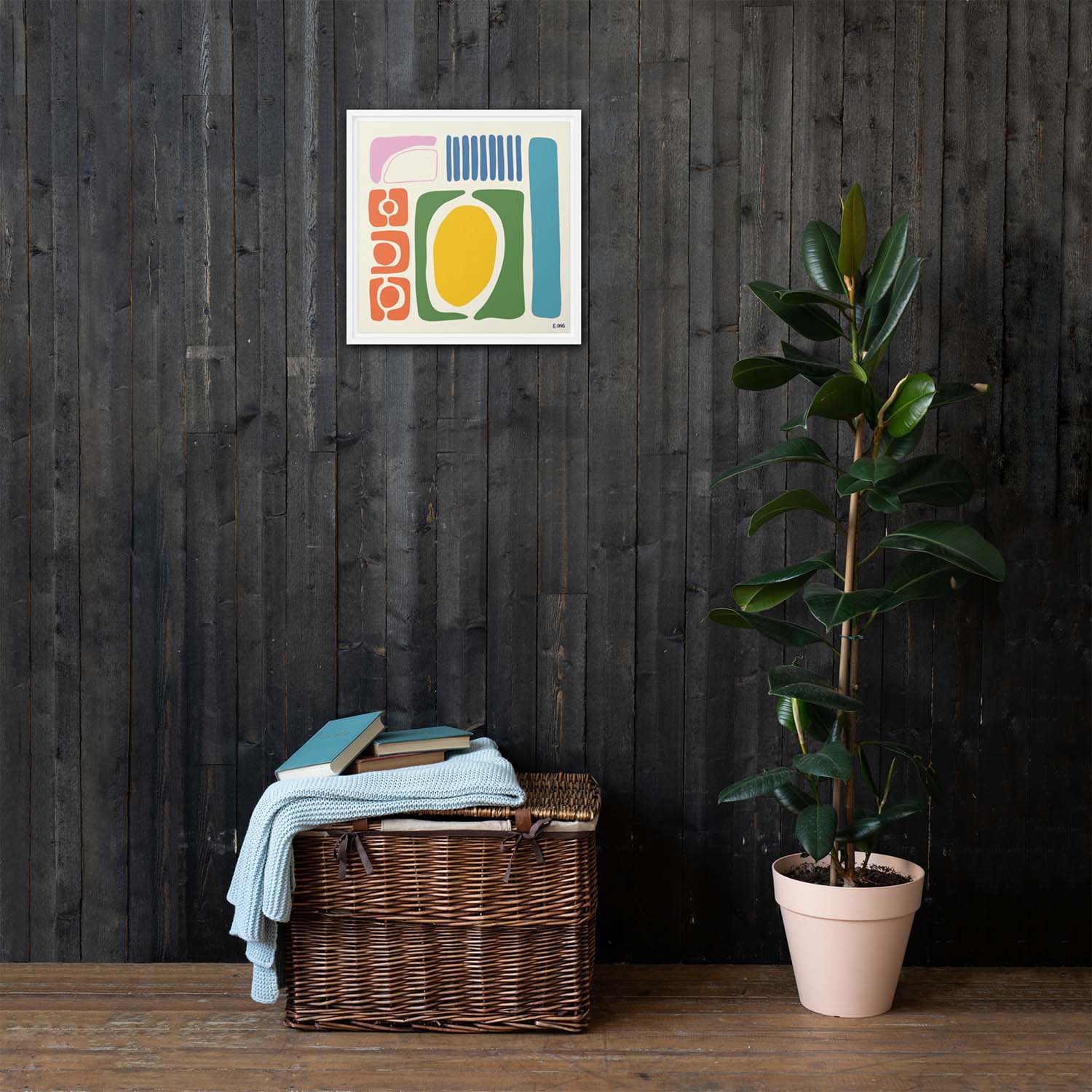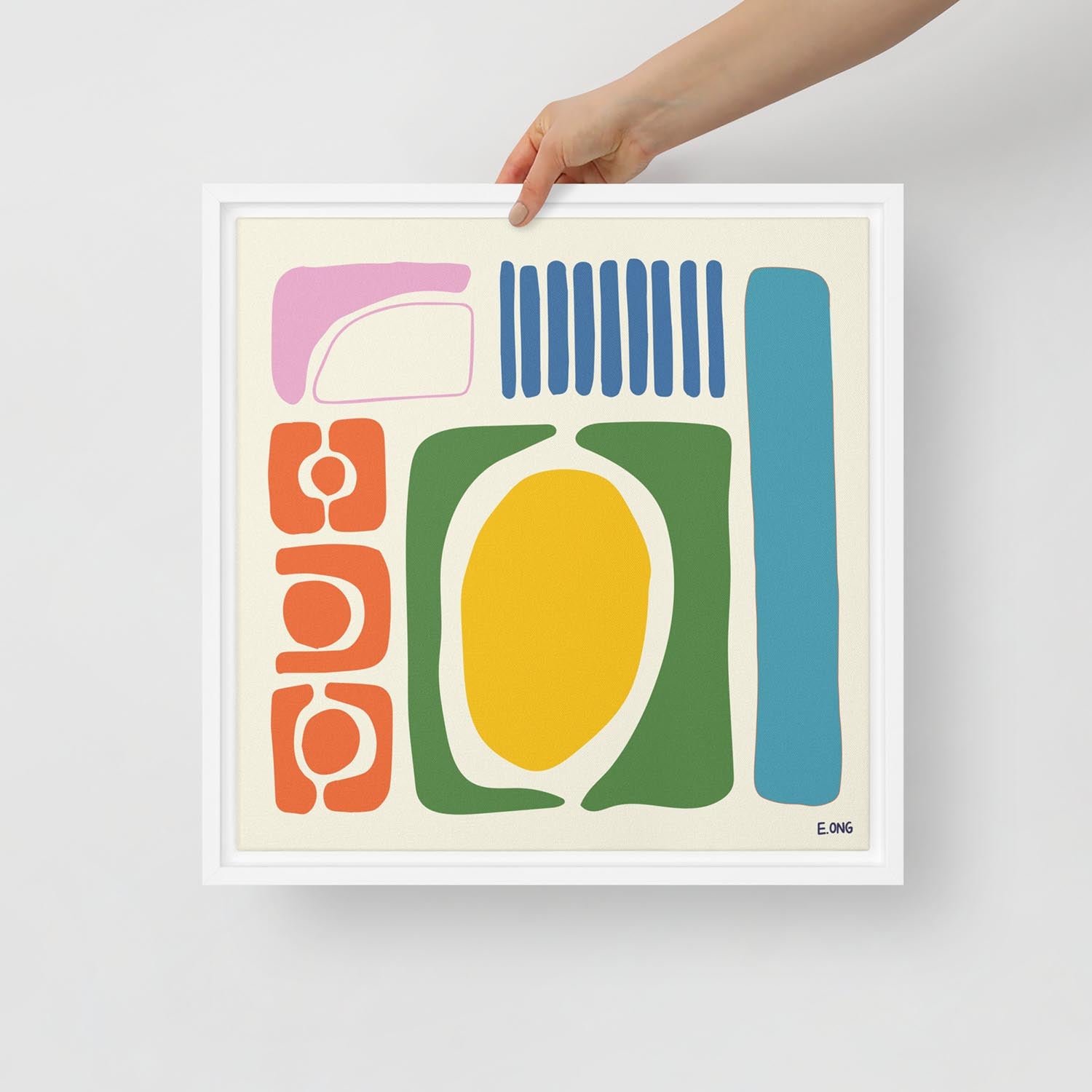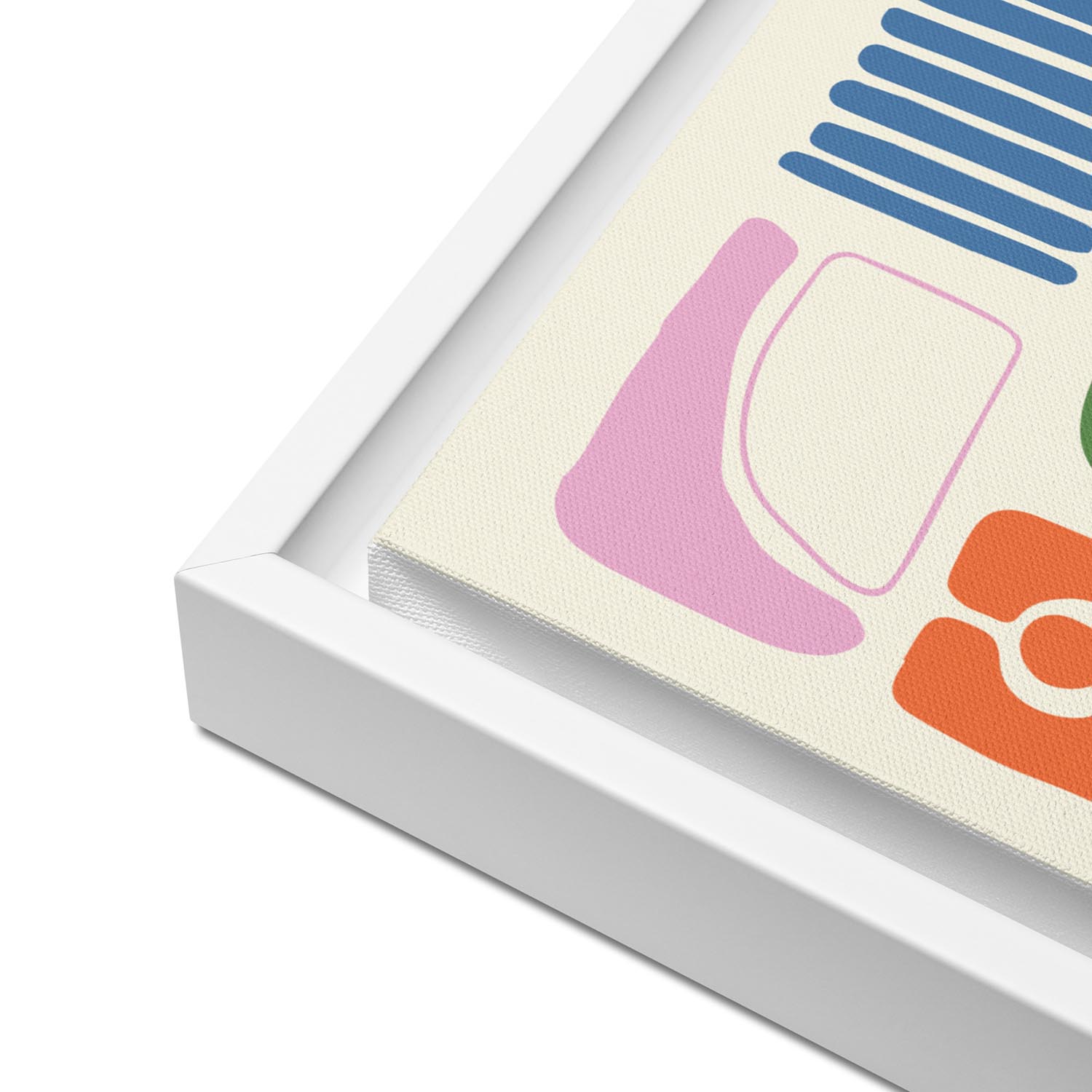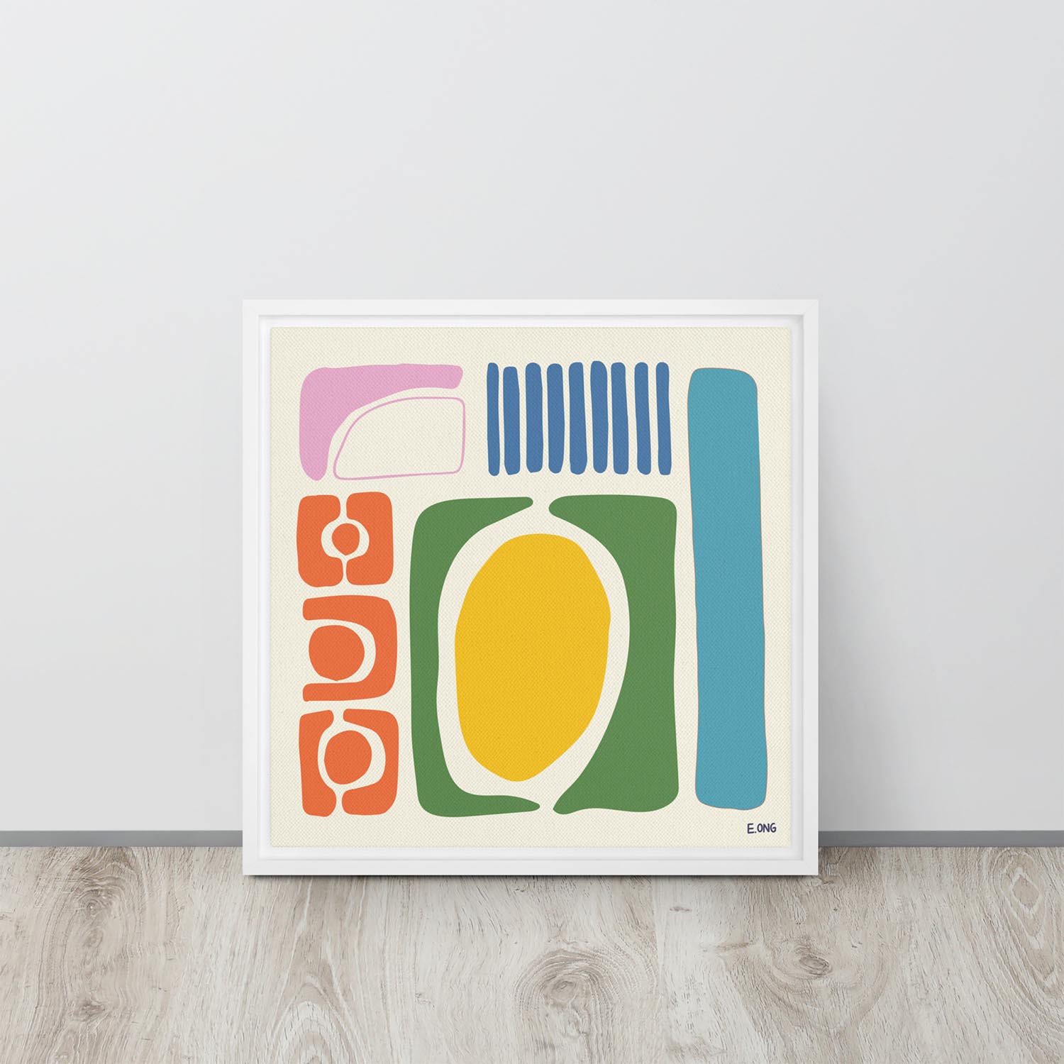 - Mounted in a white pine floater frame (1.25 in) with wall mounts